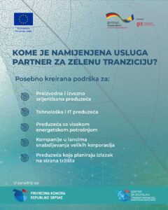 У оквиру пројекта „Дигитално одржива зелена транзиција малих и средњих предузећа у РС – DiGreenSMEs“, , који се реализује кроз Иницијативу за развој приватног сектора у БиХ, уз финансијску подршку Европске уније (ЕУ) и Владе СР Њемачке, Привредна комора Републике Српске представља нову услугу у коморском систему под називом „Партнер за зелену транзицију“.