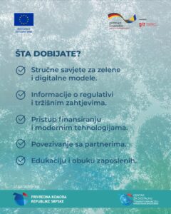 - Стручне савјете и консултантску подршку у преласку на зелене и дигиталне пословне моделе