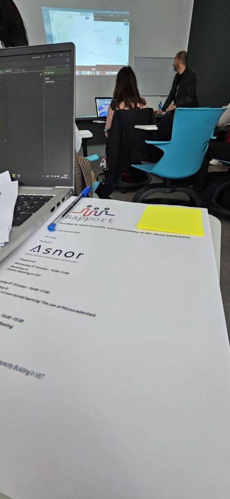 Jedan od takvih projekata je RAPPORT (Mapa za poboljšanje kvaliteta stručnog obrazovanja i obuke – teorija i praksa) koji provodimo u okviru programa Erasmus programa. Vodeći partner je MMC Menadžment Centar iz Nikozije. RAPPORT je započeo 1. januara 2025. i od 8. do 10. oktobra je organizovan sastanak projektnog tima u Bariju, Italija. Tokom redovnih projektnih aktivnosti, organizovane su i dvije radionice – „Karijerno savjetovanje u SOO“ i „Validacija neformalnog učenja: korištenje mikrokredencijala“.