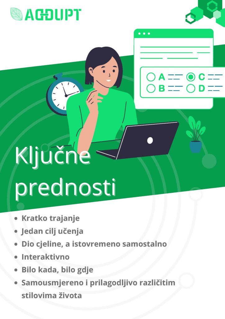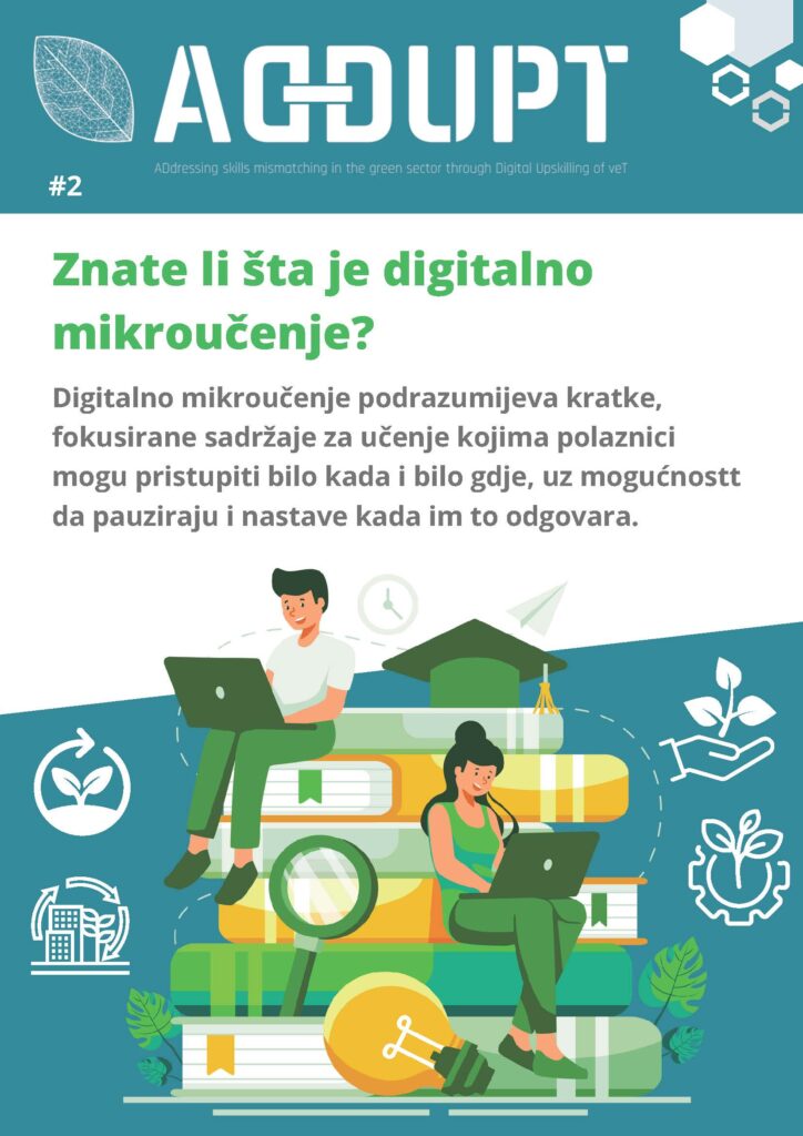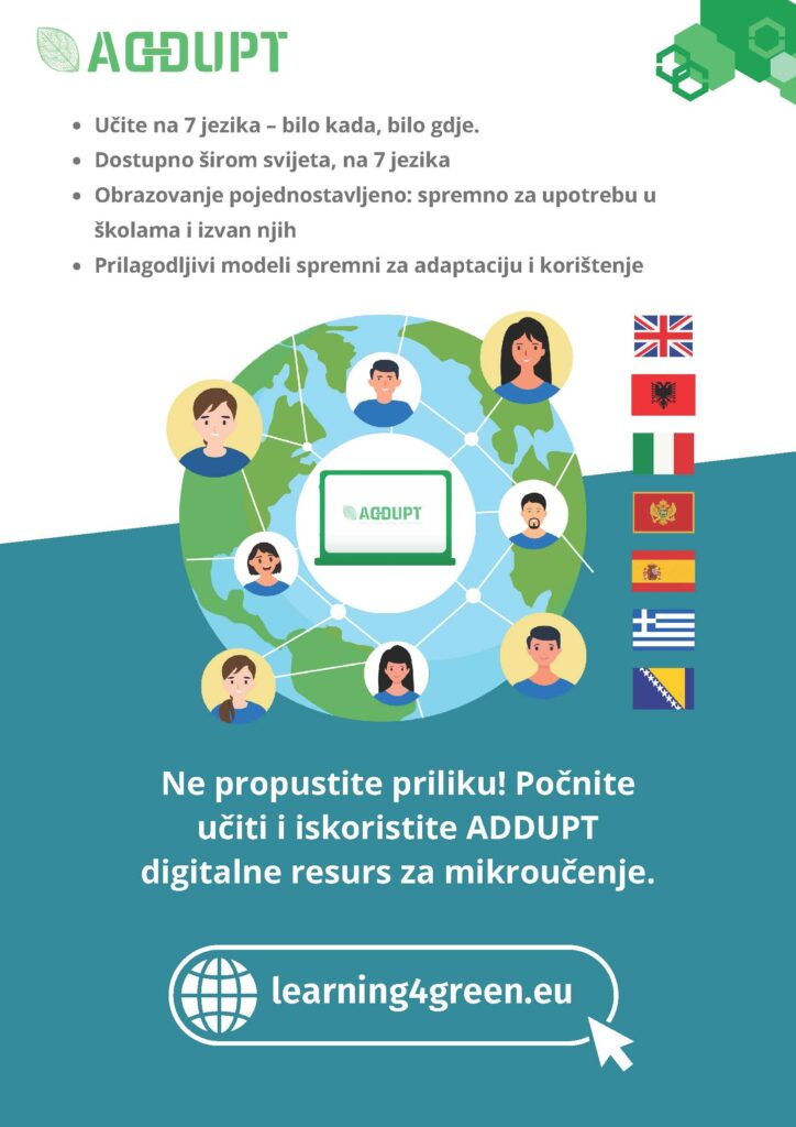 Дигитално микроучење је изузетно значајно за едукацију радне снаге јер омогућава брзо, циљно и флексибилно усвајање знања и вјештина које су директно примјењиве на радном мјесту. Кроз пројект ADDUPT, Комора се укључила у активности којима ће овај вид јачања тржишта радне снаге омогућити привредним друштвима лакше фунцкионисање на тржишту. Развијена је платфрома Learning4Green која на 7 језика нуди 60 бесплатних дигиталних ресурса за микроучење.